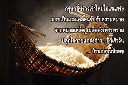 กรุ่นกลิ่นข้าวเช้าใหม่ไม่เสแสร้ง มอบเป็นแรงเคลื่อนขับกับความหมาย จากหยาดเหงื่อสู่เมล็ดดั่งเพชรพราย ปลุกใจกายแกร่งก้าว.. อีกเช้าวัน ฯ