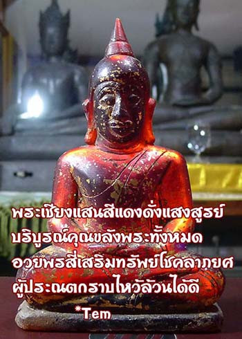 พระเชียงแสนสีแดงดั่งแสงสูรย์ บริบูรณ์คุณขลังพระทั้งหมด อวยพรสี่เสริมทรัพย์โชคลาภยศ ผู้ประณตกราบไหว้.. ล้วนได้ดี ฯ