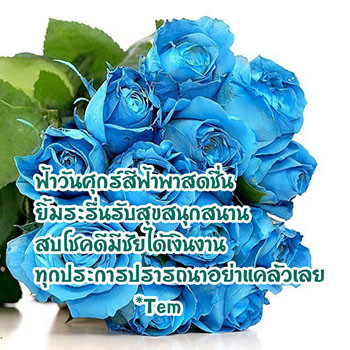 ฟ้าวันศุกร์สีฟ้าพาสดชื่น ยิ้มระรื่นรับสุขสนุกสนาน สบโชคดีมีชัยได้เงินงาน ทุกประการปรารถนา.. อย่าแคล้วเลย ฯ