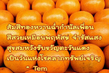 ส้มสีทองหวานฉ่ำกำนัลเพื่อน สีสวยเหมือนพฤหัสฯ จำรัสแสง สุขสมหวังรับขวัญตะวันแดง เป็นวันแห่งโชคลาภทรัพย์เจริญ