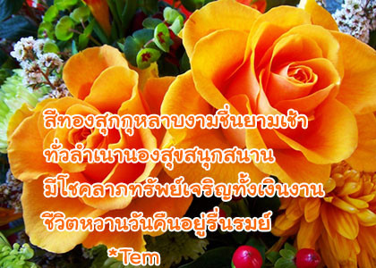 สีทองสุกกุหลาบงามชื่นยามเช้า ทั่วลำเนานองสุขสนุกสนาน มีโชคลาภทรัพย์เจริญทั้งเงินงาน ชีวิตหวานวันคืนอยู่รื่นรมย์