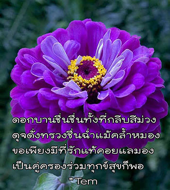 ดอกบานชื่นชื่นทั้งที่กลีบสีม่วง ดุจดั่งทรวงชื่นฉ่ำแม้คล้ำหมอง ขอเพียงมีที่รักแท้คอยแลมอง เป็นคู่ครองร่วมทุกข์สุขก็พอ