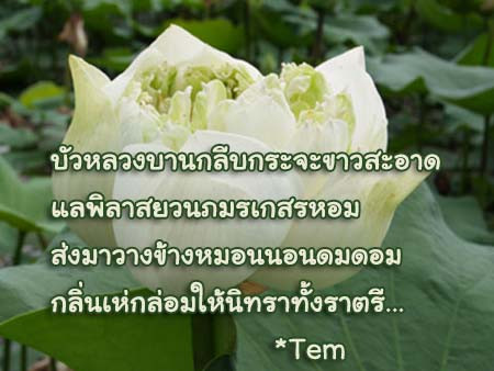 บัวหลวงบานกลีบกระจะขาวสะอาด แลพิลาสยวนภมรเกสรหอม ส่งมาวางข้างหมอนนอนดมดอม กลิ่นเห่กล่มให้นิทราทั้งราตรี
