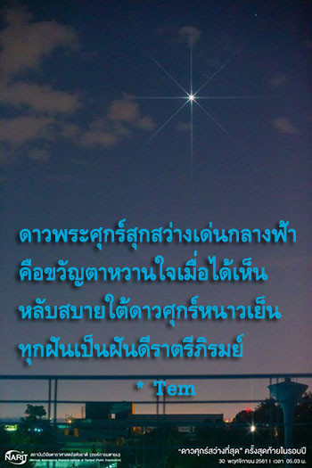 ดาวพระศุกร์สุกสว่างเด่นกลางฟ้า คือขวัญตาหวานใจเมื่อได้เห็น หลับสบายใต้ดาวศุกร์หนาวเย็น ทุกฝันเป็นฝันดีราตรีภิรมย์