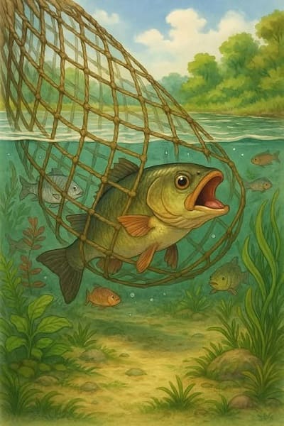 ไม่นานชาวประมงที่ผ่านมาพอดี ได้ยินคำพูดนั้นเต็มสองหู เขายิ้มร้าย รีบกลับไปเอาแหใหญ่